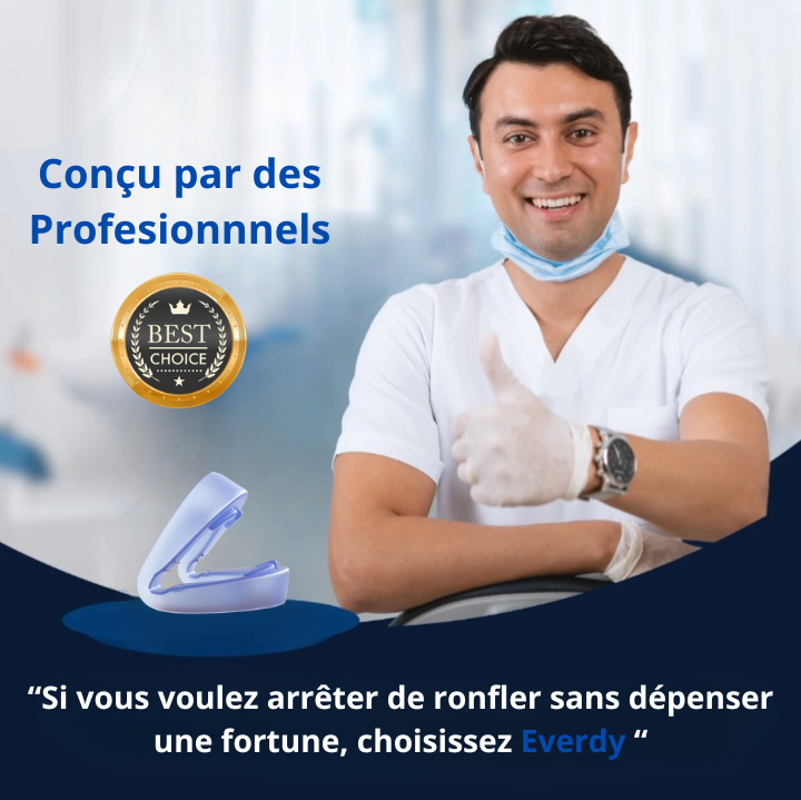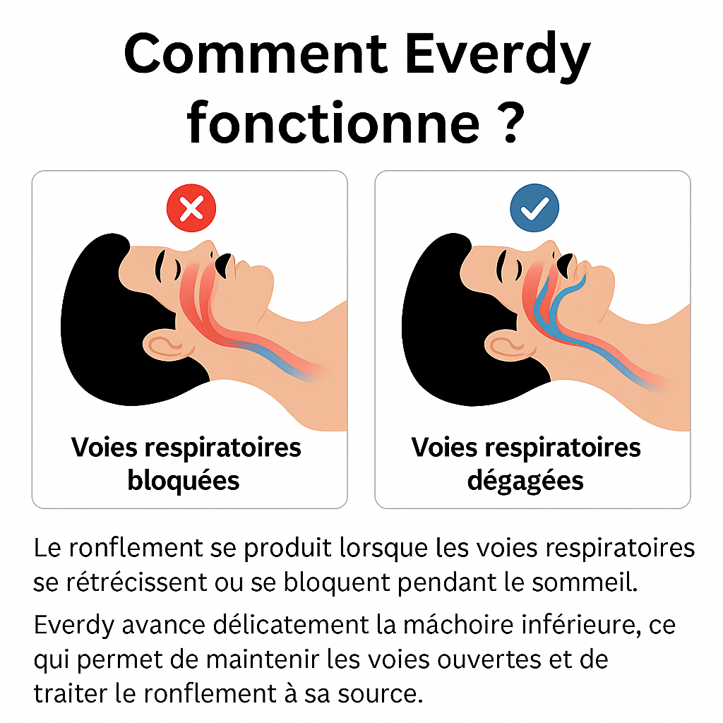 Everdy agit dès la première nuit en repositionnant délicatement la mâchoire inférieure vers l’avant – un principe validé par les spécialistes du sommeil depuis plus de 20 ans.